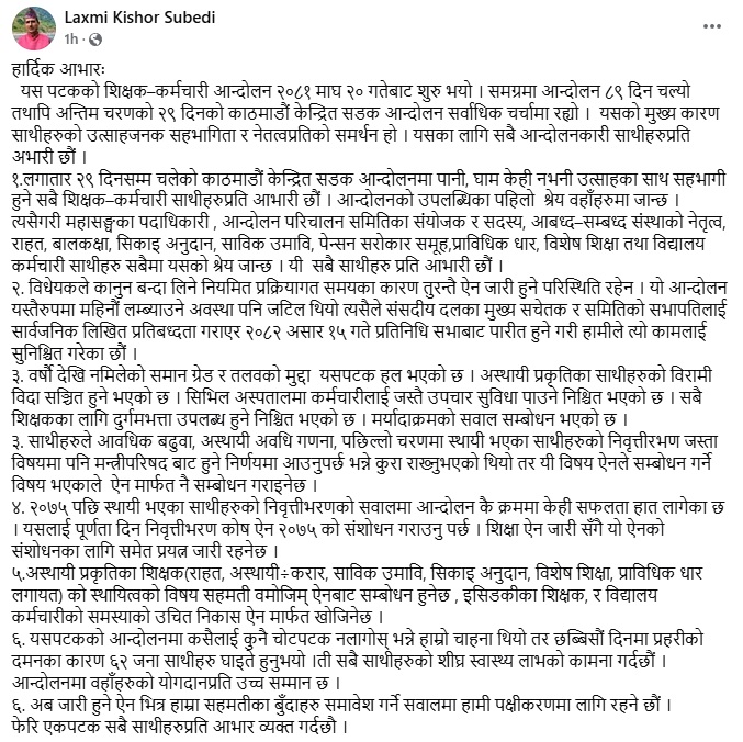 सरकार र शिक्षकबीच के के सहमती भयो भन्ने शिक्षक महासंघका अध्यक्ष लक्ष्मी किशोर सुवेदीले आफ्नो फेसबुकमा लेखेका छन्–