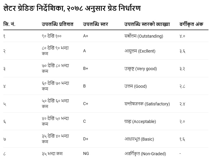 यसपालि ३.२ जीपीएदेखि ३.६ जीपीएसम्म ८१ हजार ३८५ जना, २.८ देखि ३.२ जीपीएसम्म ९९ हजार १२४ जना, २.४ जीपीएदेखि २.८ जीपीएसम्म ४८ हजार ४७९ जना, २ जीपीएदेखि २.४ जीपीएसम्म ४ हजार १२६ जना, १.६ जीपीएदेखि २ जीपीएसम्म ८ जना ग्रेडेड भएको राष्ट्रिय परिक्षा बोर्ड अध्यक्ष महाश्रम शर्माले जानकारी दिए।