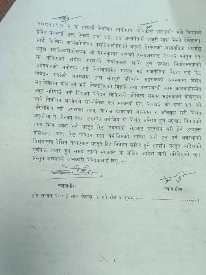 यता निर्वाचन आयोगले गगन समितीलाई आधिकारिता दिएपछि नेपाली कांग्रेसले उनकै नेतृत्वमा चुनाव लडेको थियो। देउवा पक्षकै धेरै नेताहरु गगनलाई सभापती स्विकार गर्दै टिकट लिएर चुनाव लड्न पुगेका थिए। तर चुनावपछि देउवा समूहको समानान्तर गतिविधि देखियो। सर्वोच्च अदालतमा मुद्धा विचाराधिन रहेको तर्क गरेर उनिहरु गतिविधि गरिरहेका थिए। शुक्रबार सर्वोच्च अदाततले गगन समितीलाई आधिकारिक नेपाली कांग्रेसको मान्यता दियो, विशेष महाधिवेशनलाई मान्यता दियो।