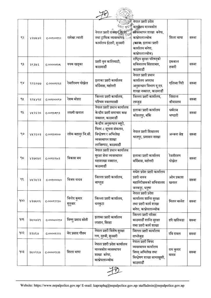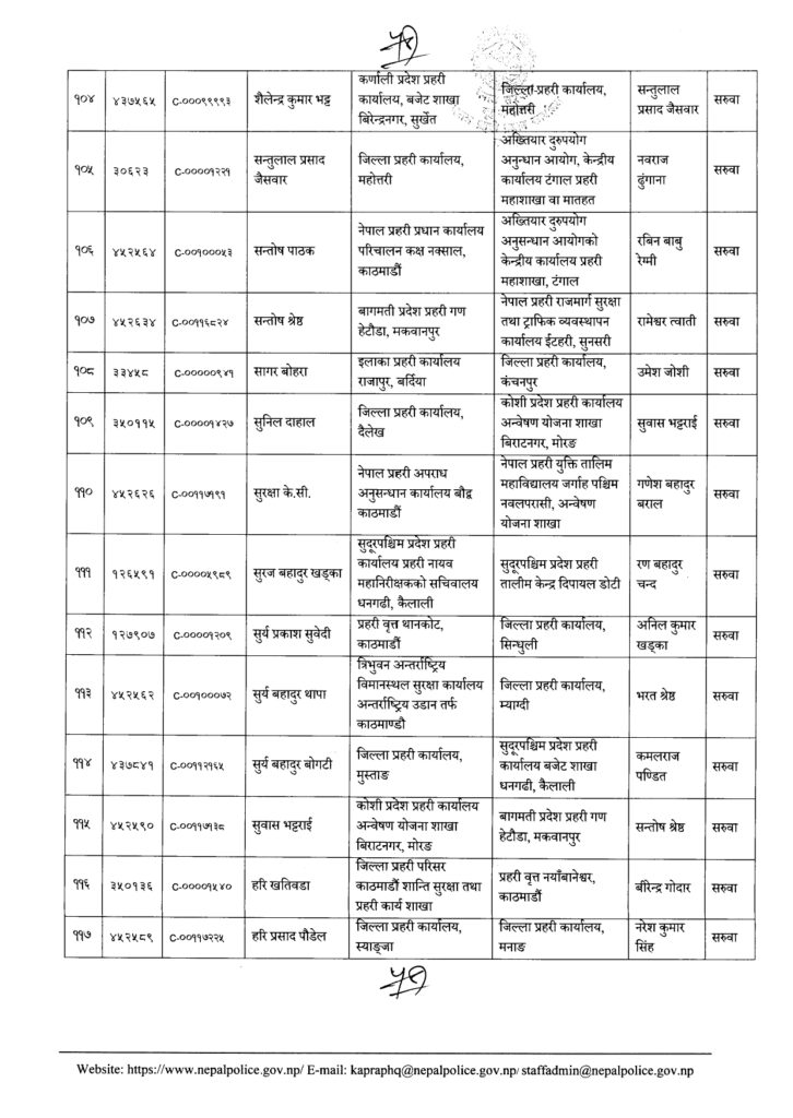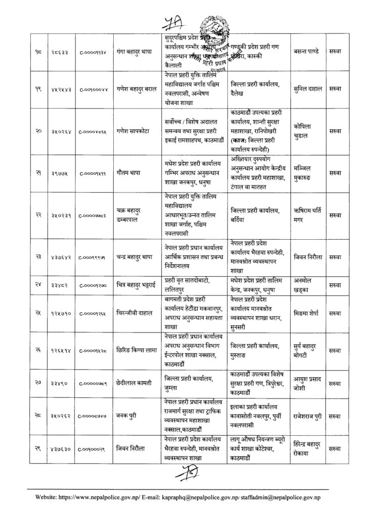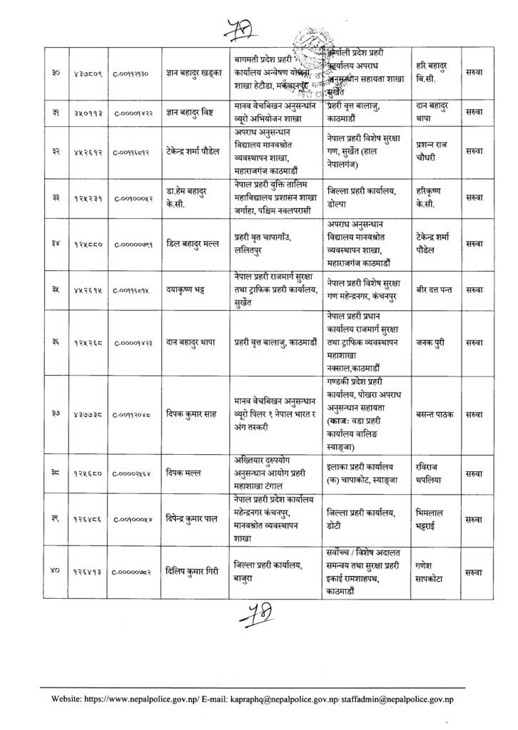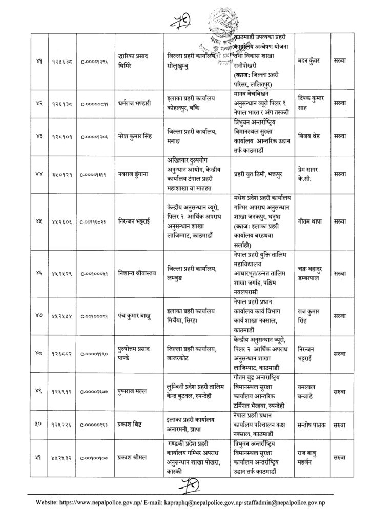 Share Facebook Twitter LinkedIn Pinterest Email काठमाडौं। नेपाल प्रहरीका एक सय २१ नायब उपरिक्षक-डीएसपीको सरुवा भएको छ। प्रहरी प्रधान कार्यालयले बुधबार राती सरुवा निकालेको हो। यो सरुवाले केही जिल्ला, वृतलगायत युनिटहरुको नेतृत्व फेरिएका छन्। हेर्नुस्- को कहाँ पुगे ? Author एनआरएन View all posts