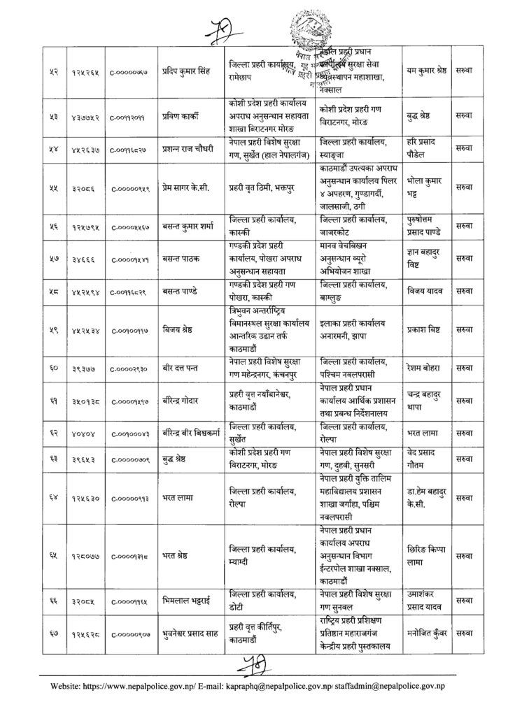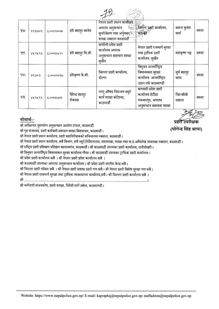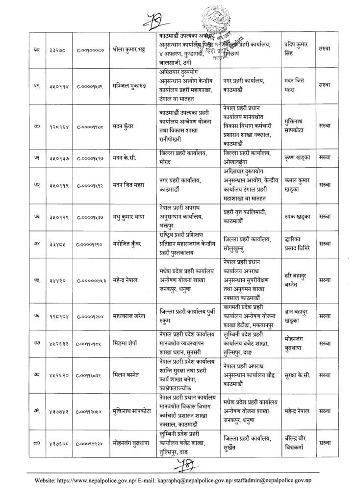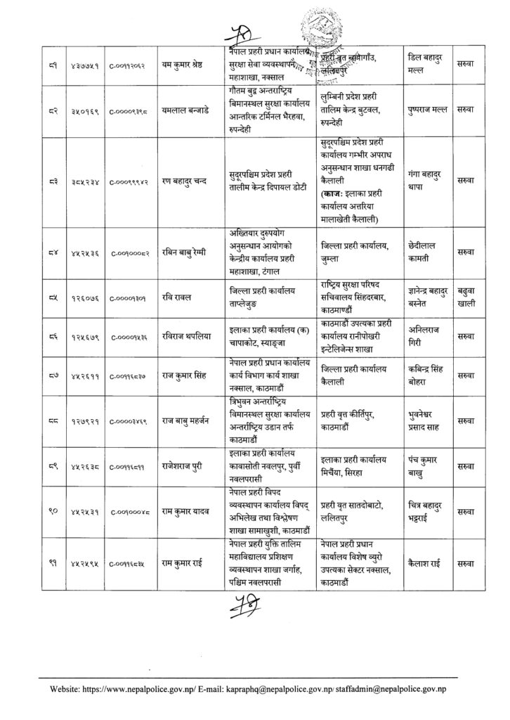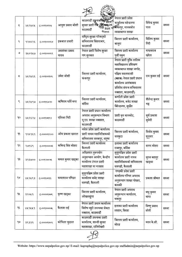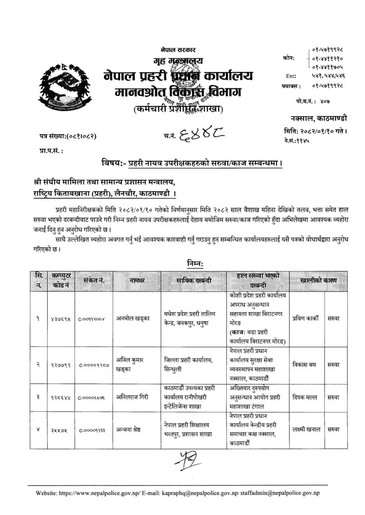 Share Facebook Twitter LinkedIn Pinterest Email काठमाडौं। नेपाल प्रहरीका एक सय २१ नायब उपरिक्षक-डीएसपीको सरुवा भएको छ। प्रहरी प्रधान कार्यालयले बुधबार राती सरुवा निकालेको हो। यो सरुवाले केही जिल्ला, वृतलगायत युनिटहरुको नेतृत्व फेरिएका छन्। हेर्नुस्- को कहाँ पुगे ? Author एनआरएन View all posts