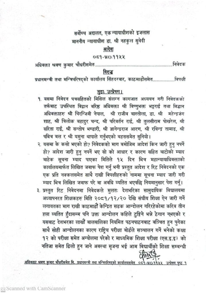 नहकुल सुवेदीको एकल इजलासले अधिवक्ता श्रवणकुमार चौधरीसमेतले दायर गरेको रिटमा बिहीबार प्रारम्भिक आदेश गरेको छ। यो आदेशले आन्दोलनरत शिक्षकभन्दा बढी सरकारमाथी दबाब दिएको देखिन्छ।