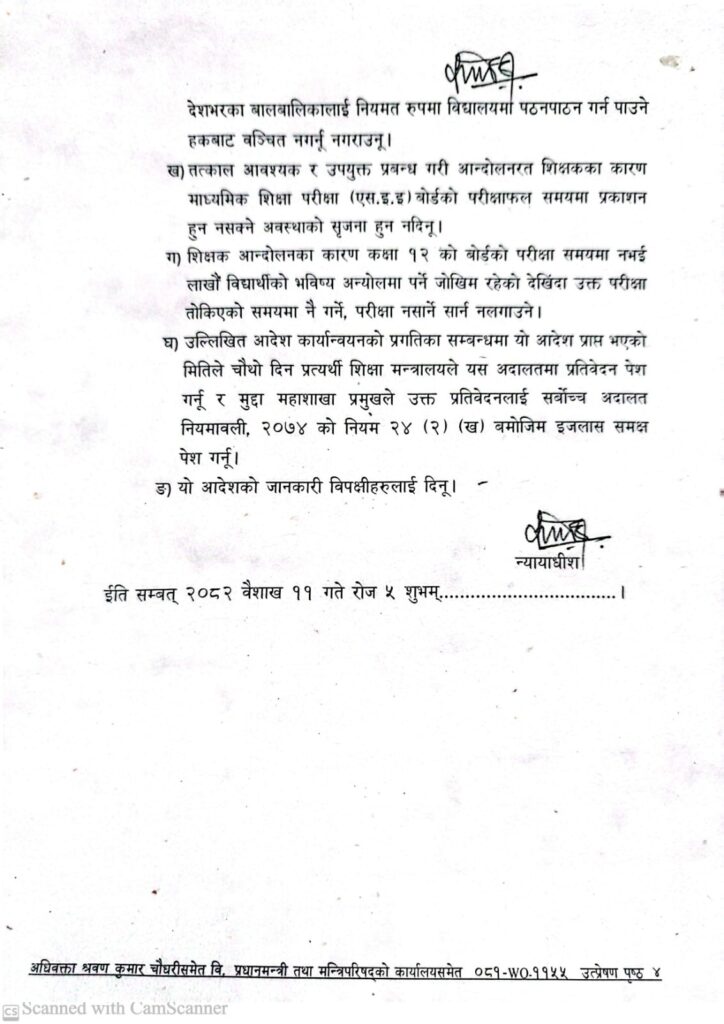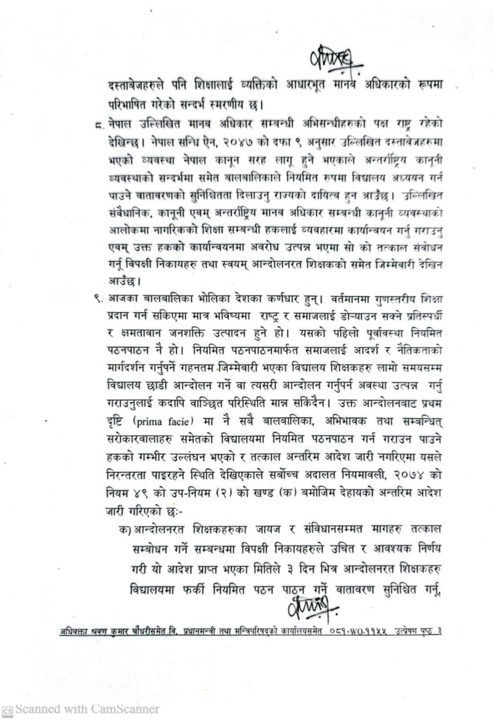 शिक्षकहरुले राखेका माग सम्बोधनमा उचित र आवश्यक निर्णय गरी आदेश प्राप्त भएको तीन दिनभित्र काममा फर्काउने बाटो बनाउन सर्वोच्च अदालतले सरकारका नाममा आदेश गरेको हो।