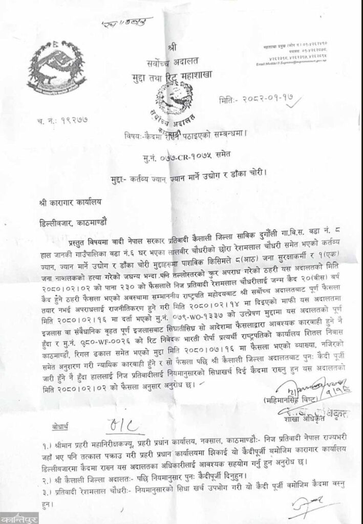 साँझ सर्वोच्च अदालतकै पत्रबाट डिल्लीबजार कारागारमा उकुसमुकुस भइरहेका रेशम चौधरी छुटे।