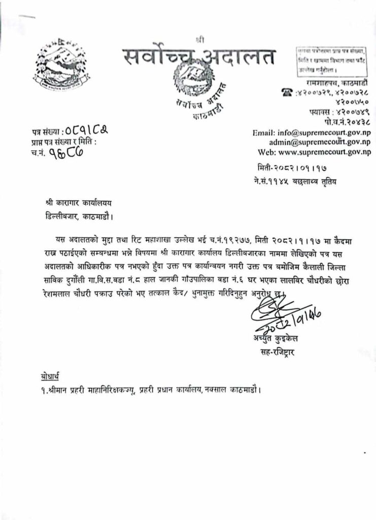 अनि सर्वोच्च अदालतले पनि व्यक्ति पक्राउ परेर,कारागार चलान भएको केही घण्टामा मात्र थाहा पाउने रहेछ।