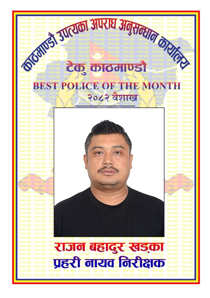 काठमाडौं। काठमाडौं उपत्यकाका ठुला र गम्भिर प्रकृतीका अपराधको अनुसन्धान गर्ने जिम्मेवारी पाएको काठमाडौं उपत्यका अपराध अनुसन्धान कार्यालयमा महिनाभर सर्वोंकृष्ट काम गरेको भन्दै नायब निरिक्षक-सई राजन खड्का पुरस्कृत भएका छन्।