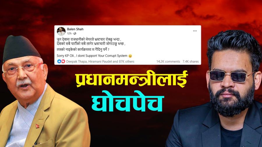 काठमाडौं। काठमाडौं महानगरपालिकाका मेयर बालेन्द्र शाह बालेनले प्रधानमन्त्री केपी शर्मा ओलीलाई लक्ष्यित गर्दै सामाजिक सन्जालमा अर्को स्टाटस लेखेका छन्।