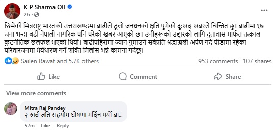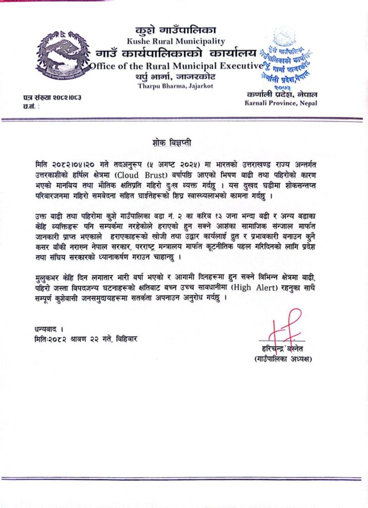उक्त गाउँपालिकाले एक विज्ञप्ती जारी गर्दै उत्तराखण्डको धरालीमा गएको बाढीमा आफ्नो ठाउँका कम्तिमा १३ जना हराइरहेको जनाएको छ।