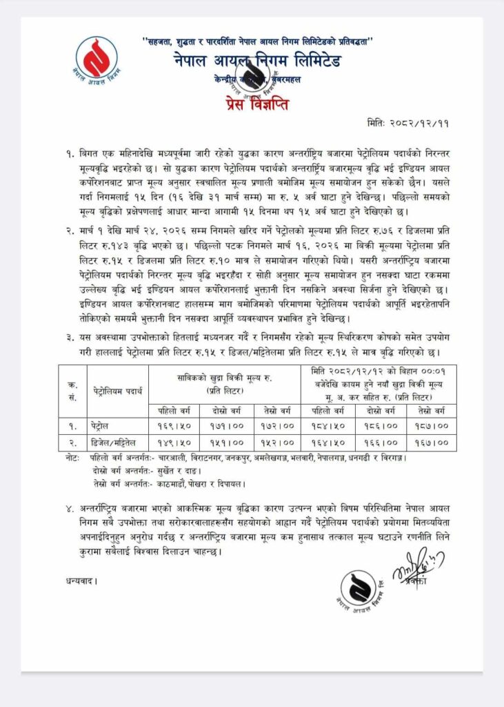 बुधबार नेपाल आयल निगमले पेट्रोल प्रति लिटर १५ रुपैयाँले बढाएको छ। अघिल्लोपटक पनि १५ रुपैयाँले बढेको थियो। अब पेट्रोल प्रति लिटर एक सय ८७ रुपैयाँ पुगेको छ। यस्तै डिजेल र मट्टीतेलको मुल्य पनि प्रति लिटर १५ रुपैयाँले बढेर क्रमश एक सय ६७ रुपैयाँ पुगेको छ।
