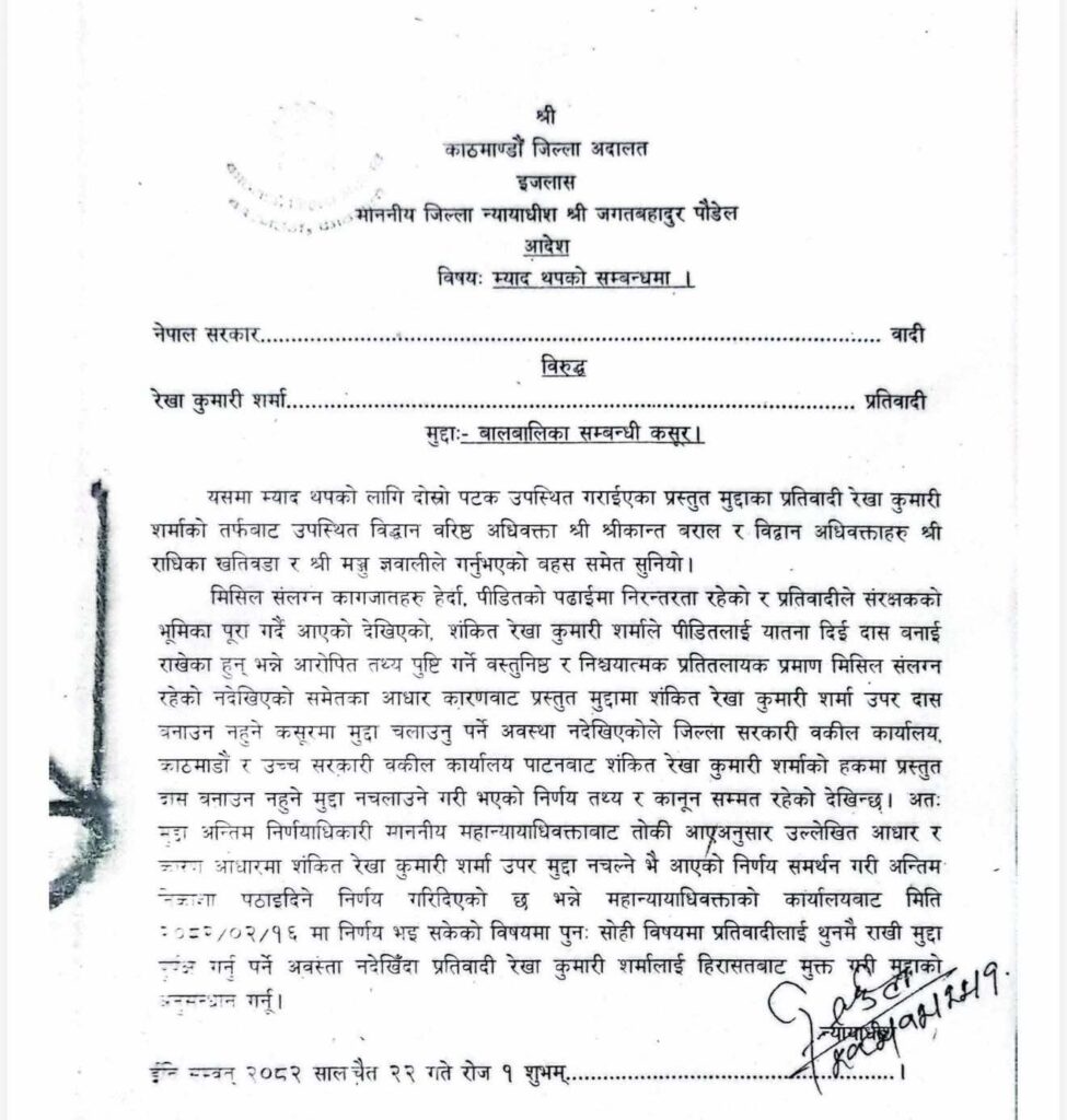 काठमाडौं। सर्वोच्च अदालतले बाल श्रमको आरोपमा पक्राउ गरिएकी एमाले प्रदेश सांसद रेखा शर्मालाई थुनामुक्त गर्न आदेश दिउको छ। आइतबार सर्वोच्चले उक्त आदेश गरेको थियो।